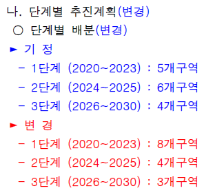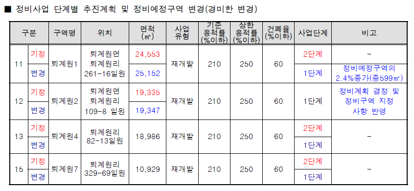 단계별 추진계획이 2단계에서 1단계로 변경됐다는 것은 사업진행속도가 빨라지는 것을 의미한다. 2단계는 2024~2025년 계획이었다면, 1단계는 2020~2023년 계획이다. 퇴계원2구역은 처음부터 1단계였고 실제로 사업진행속도도 가장 빠르다. 퇴계원1구역, 퇴계원4구역, 퇴계원7구역은 2단계에서 1단계로 변경됐다.