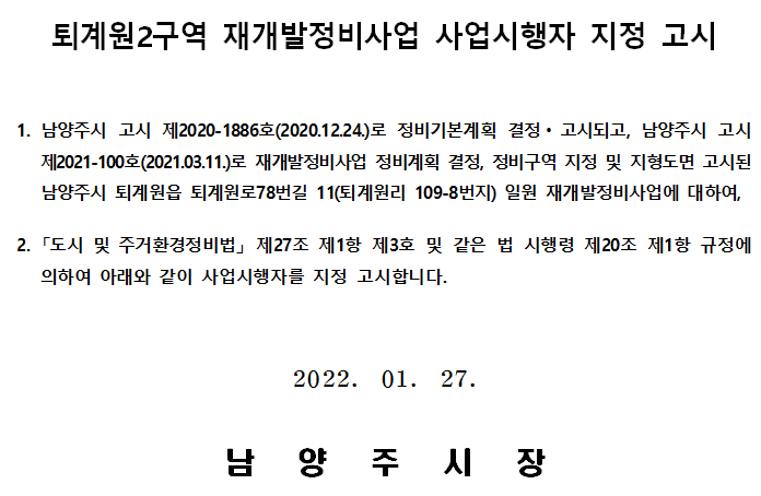 최근 퇴계원 재개발 구역에 대한 경미한 변경이 있었다. 경미한 변경은 '면적'이고, 사업단계를 보면 상당한 변경이라고 하고 싶다. 사업단계가 2단계에서 1단계로 변경된 것이었다.