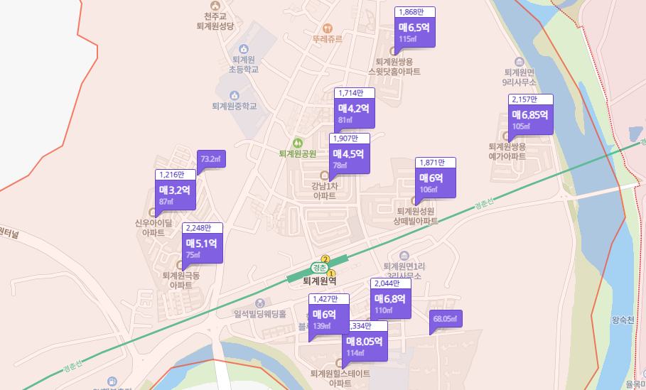 퇴계원 힐스테이트 아파트가 8억원 정도로 가장 높은 가격을 보여주고 있다. 하지만 아파트가 있는 곳 이외의 지역들은 입지에 비해 낙후된 모습이 많이 보였다.