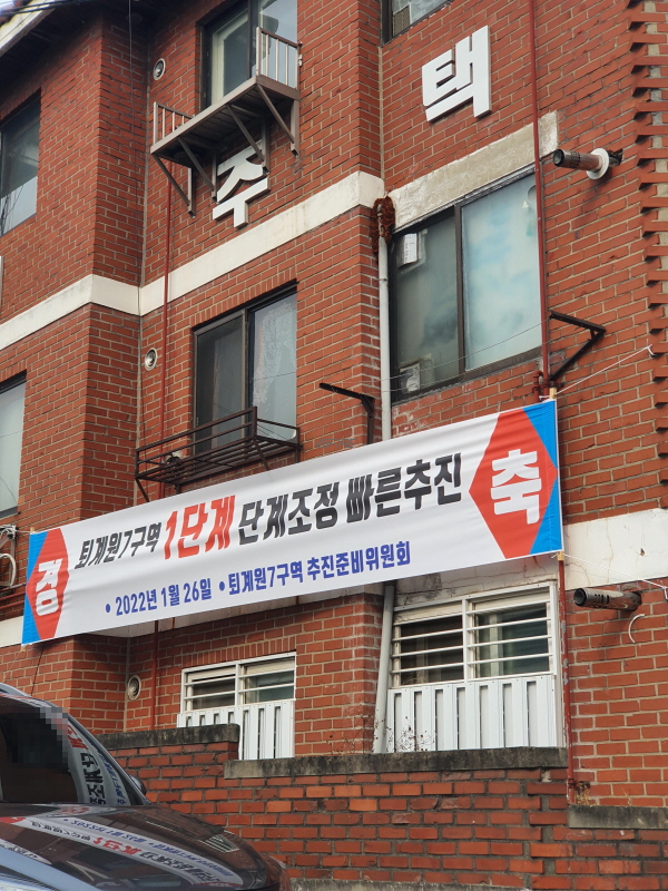 역시 1단계 조정 축하 현수막이 보였다.