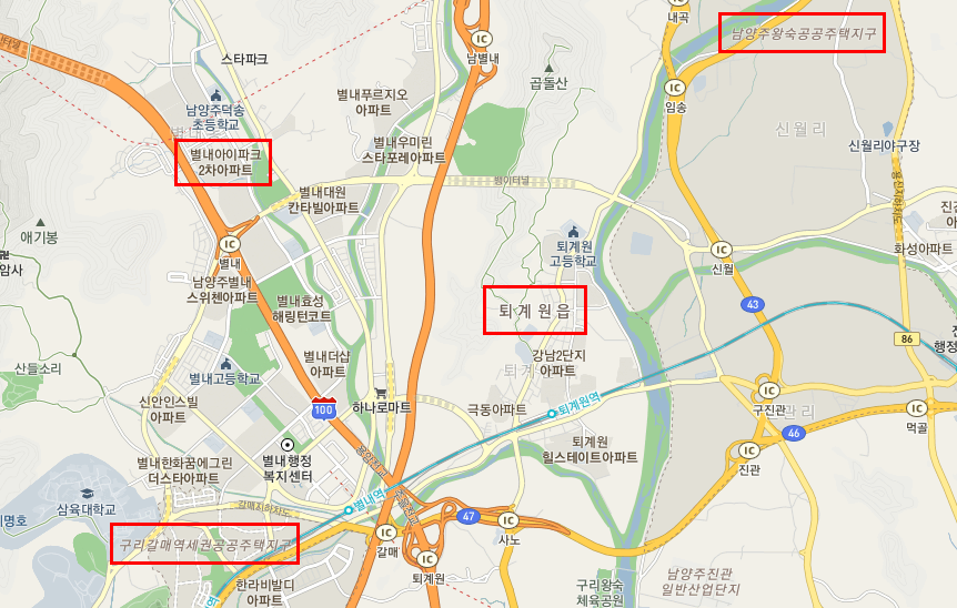퇴계원읍은 입지가 좋다. 좌별내, 우왕숙, 남다산이다. 좌측으로 별내 신도시와 갈매신도시가 있고, 우측으로 왕숙 신도시가 들어올 예정이다. 남쪽으로는 위 지도에는 안 나오지만 다산신도시가 있다. 지하철 8호선이 연장되는 별내역까지도 경춘선으로 한 정거장 거리이다.