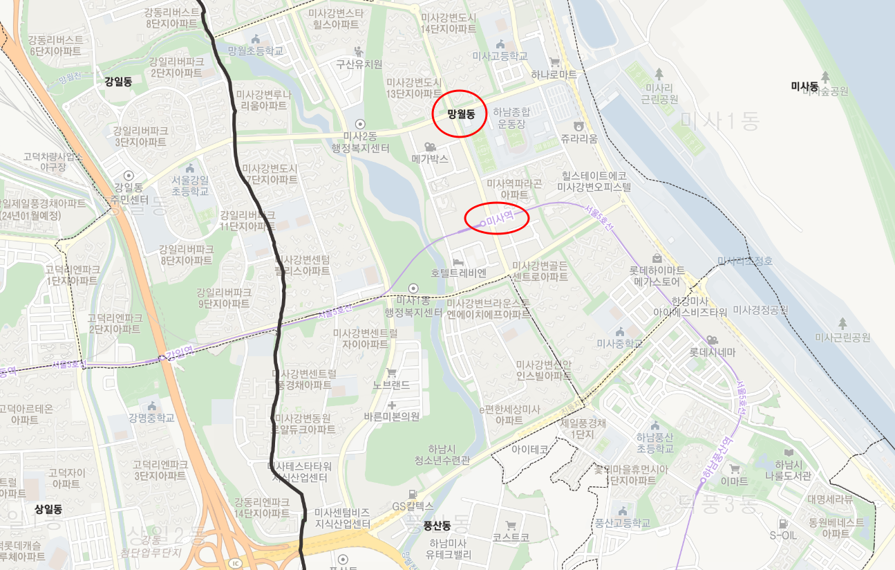9호선 미사연장은 결정됐는데 지하철역 위치는 아직 정해지지 않았다고 한다. 망월동 부동산에서는 지하철역이 생길 곳을 대충 예상하고 있었다. 실제로 그 자리에 지하철역이 생길지 확실하지 않지만 그 위치는 아래와 같다.