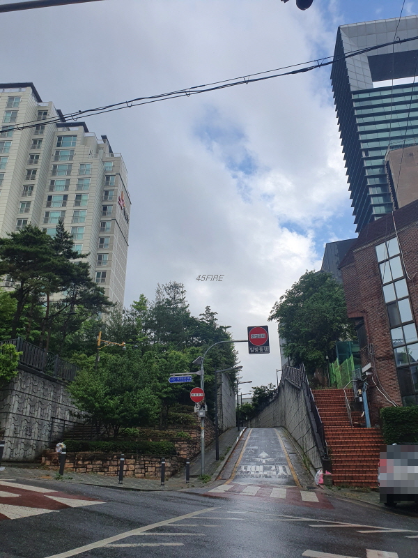 왼쪽이 삼선SK뷰 아파트, 오른쪽으로 큰 교회가 있다. 그 사이 도로는 일방통행만 가능한 좁은 도로였다.