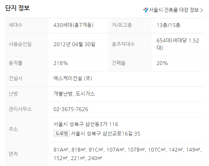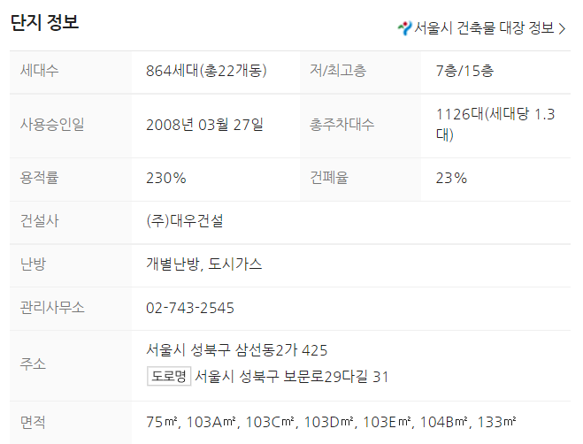 총 864세대로 삼선SK뷰 아파트보다 세대수가 많다. 주차대수는 1.3대로 부족하지 않아 보인다. 사용승인은 2008년으로 삼선SK뷰 아파트보다 4년 정도 오래됐다.
