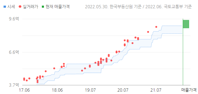 5년 전에는 4억 초반대였는데, 최근 실거래가는 2021년 8월의 8.9억이다. 호가는 8.8~9.5억이다. 전세는 3건 올라와 있는데, 4.6억, 5억, 5.5억이다. 전세 및 매매 모두 가격이 상대적으로 낮은 것은 저층이었다.