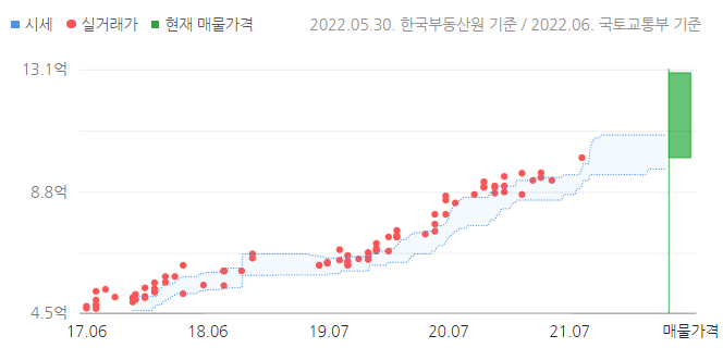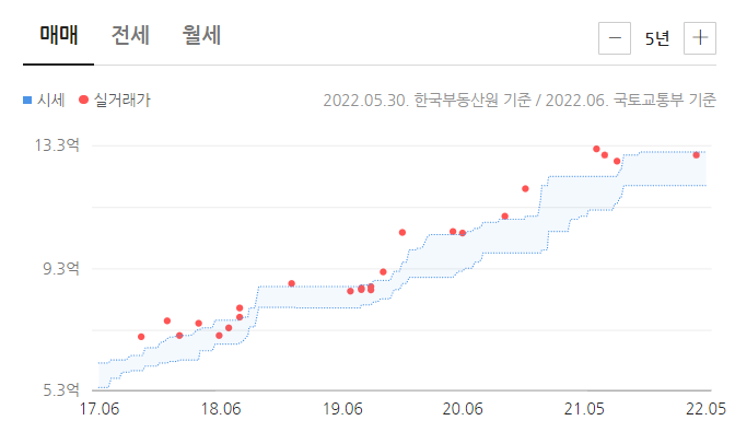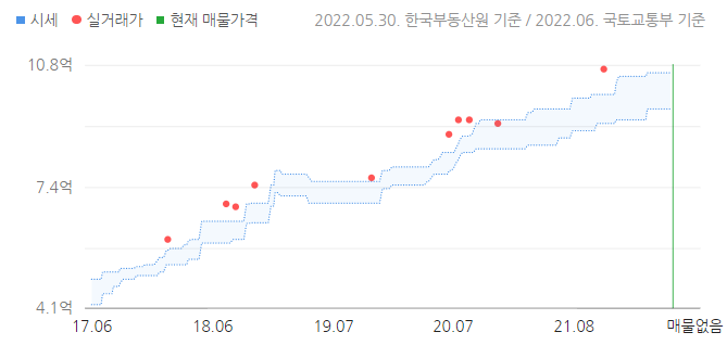 31A평형은 5년 전에 4억 중후반대였다. 가장 최근 실거래가는 2021년 9월로 10억원이다. 현재 호가는 10.2억부터 13억까지 있는데, 10억원대가 많다. 전세는 6억원에 2건이 있다.