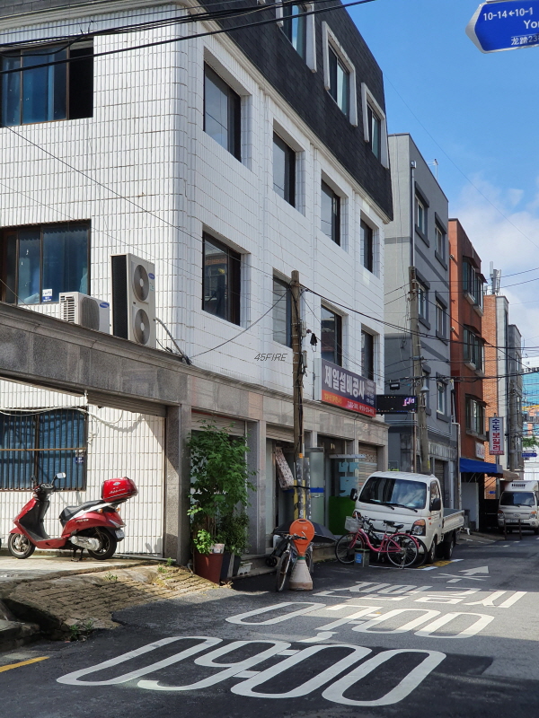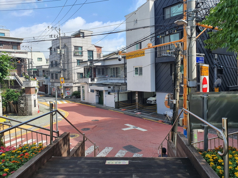 골목에서 넓은 도로로 나가기 전의 모습이다. 도로변에는 역시 깔끔한 건물이 있다.