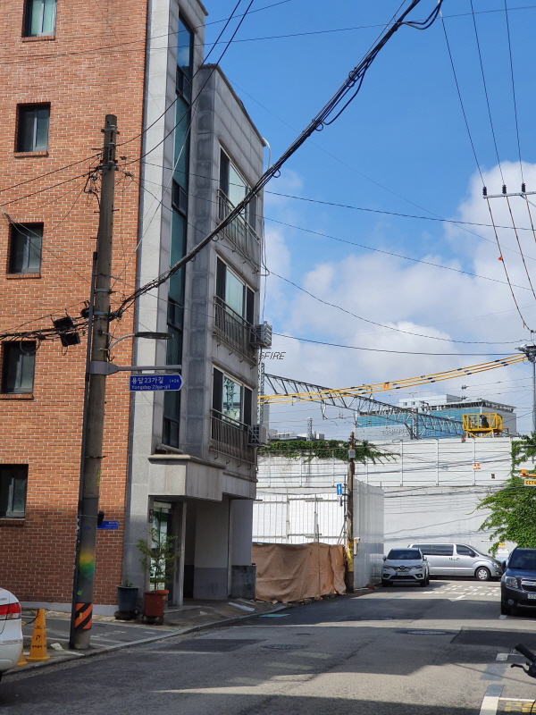 용답초등학교 인근에서 찍은 사진이다. 가운데에는 전형적인 2층 짜리 단독주택이 있다. 양옆으로는 높은 건물이 있는데 왼쪽 건물은 그래도 지은지 몇 년이 지난 것 같고 오른쪽은 더 높고 최근에 건축한 것처럼 깔끔하다. 위 사진에 안 나오는 오른쪽으로도 비슷한 높이의 건물이 올라가고 있었다.