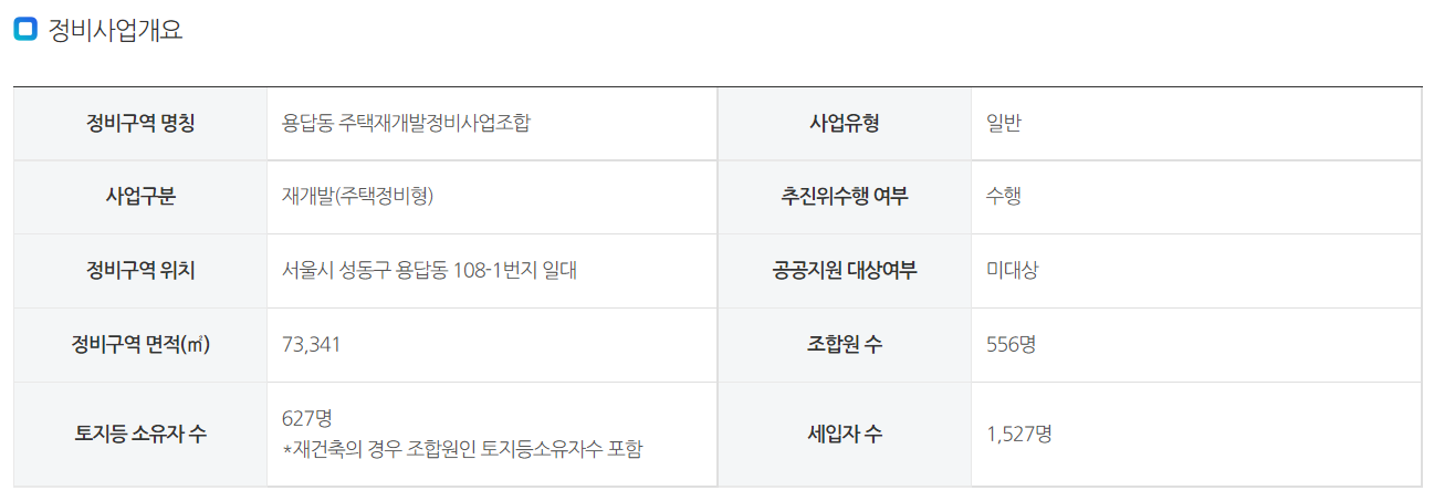 먼저 용답역 주변에 재개발을 진행하는 곳이 있다. 용답역 108-1번지 일대인데 답십리역 초역세권으로 입지가 매우 좋아 보인다. 2007년 9월에 정비구역으로 지정된 이후 2007년 11월 조합설립인가, 2009년 6월 사업시행인가를 받았다. 이후 사업이 정체되었는지 2018년 7월이 되어서야 관리처분인가가 났다.