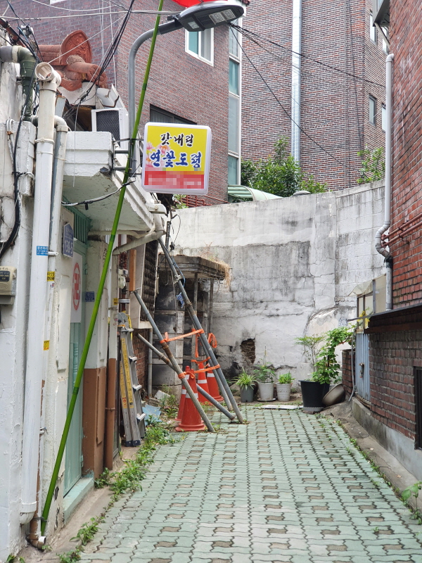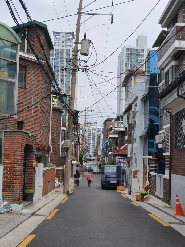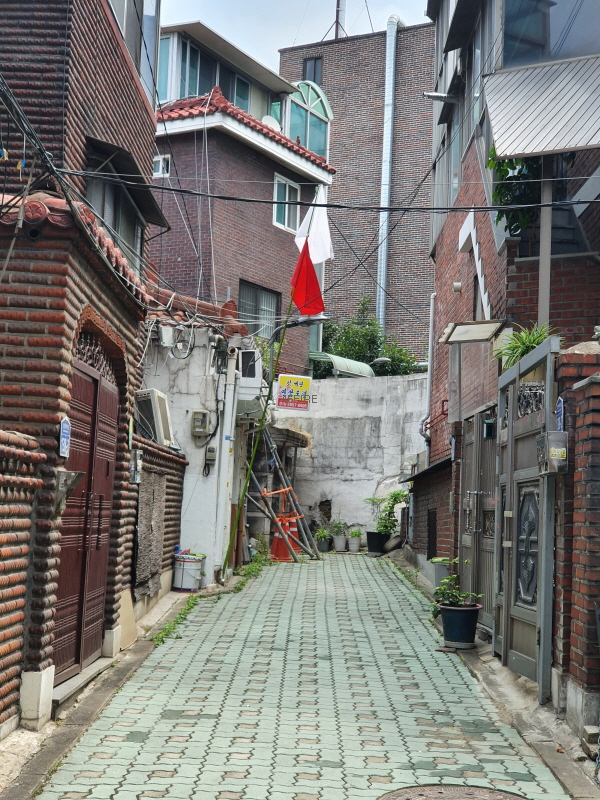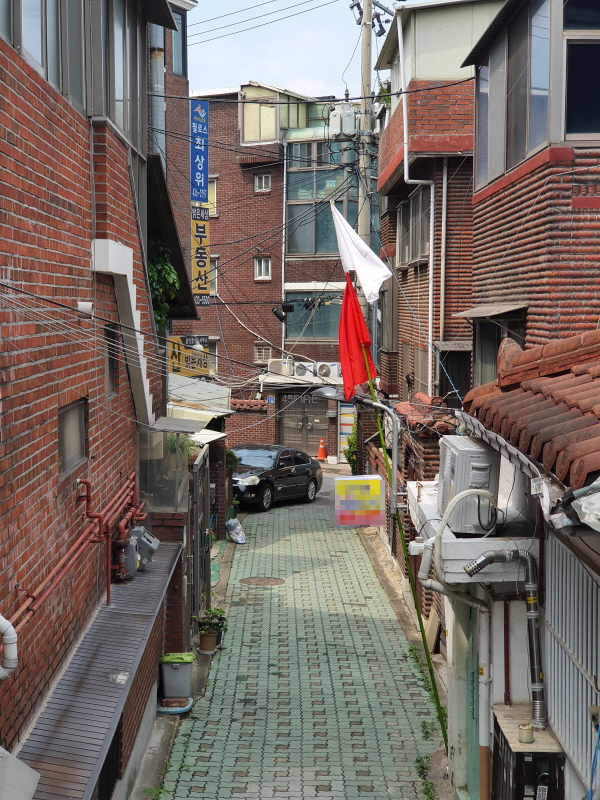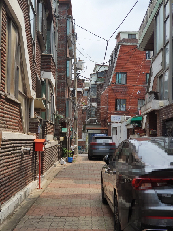 골목 안쪽에서 바깥쪽을 바라본 모습이다. 주택들이 모두 비슷한 시기에 지어졌을 것이다.
