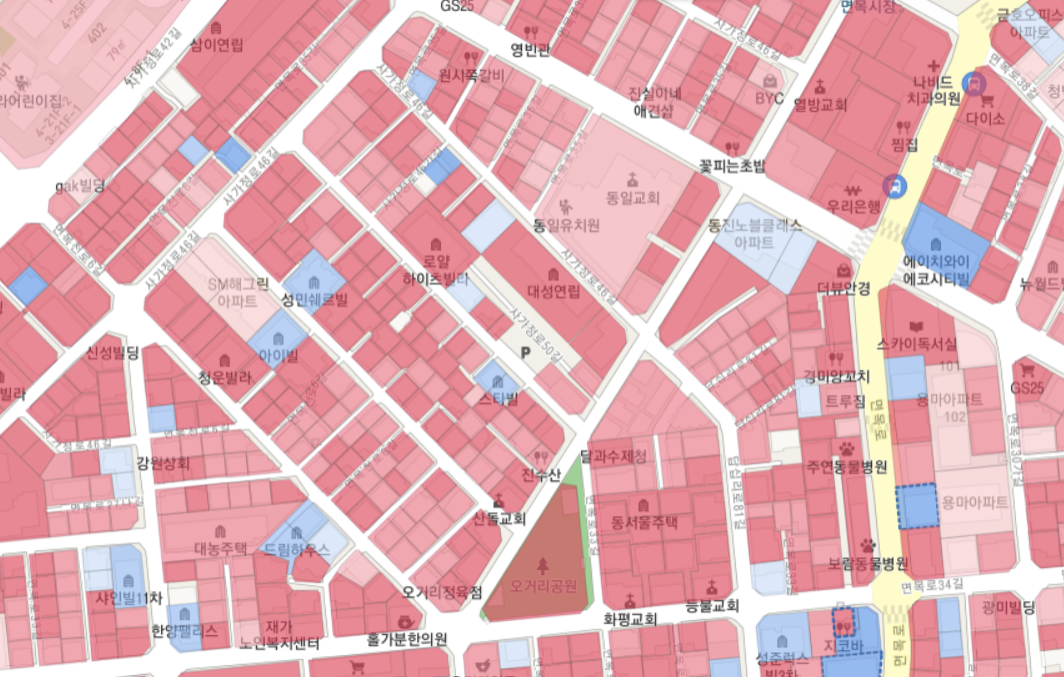 면목시장 주변의 노후도를 나타낸 것이다. 몇몇 신축 건물들이 생겼지만 전체적으로 노후된 편이다.