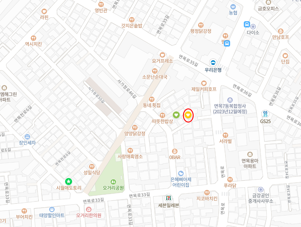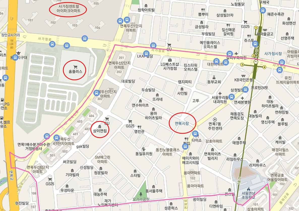 중랑구 면목동은 규모가 큰 편이다. 이번에 다녀온 곳은 면목7동이었다. 면목7동은 사가정역과 용마산역 사이에 있다. 위 지도에는 7호선 라인을 따라 왼쪽을 주로 표시했는데, 오른쪽도 상당히 넓은 부분이 면목7동이다. 주변에는 사가장 센트럴 아이파크 아파트, 홈플러스 등이 있다. 삼이연립은 지나가면서 우연히 봤는데 투자 가치가 있어 보였다.