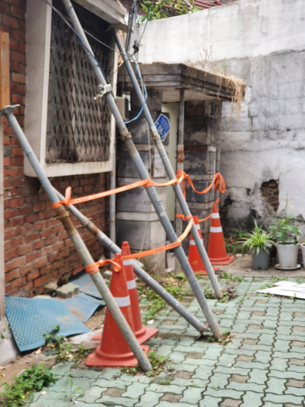 붕괴의 위험이 있는지 이상한 것들을 설치해놨다. 겉으로 보기에는 빨간벽돌의 전형적인 주택이다.
