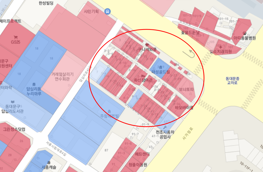 지난 글에서는 답십리역 주변으로 역세권 시프트, 지역주택조합 등을 추진하는 곳을 다뤘다. 이번 글은 답십리동에서 청량리역에 가까운 곳이다. 매우 노후된 단측 단독주택들이 모여 있는 곳도 있고, 감정가 47억 상당의 상가 건물도 경매로 나왔다.