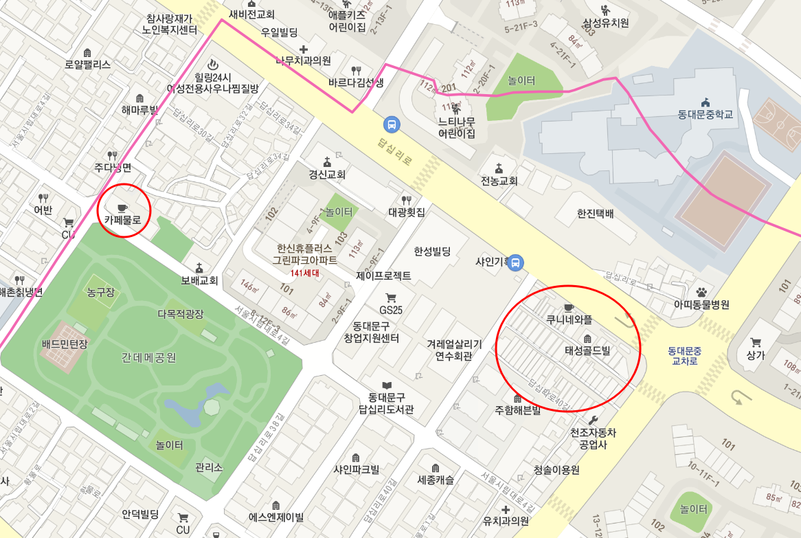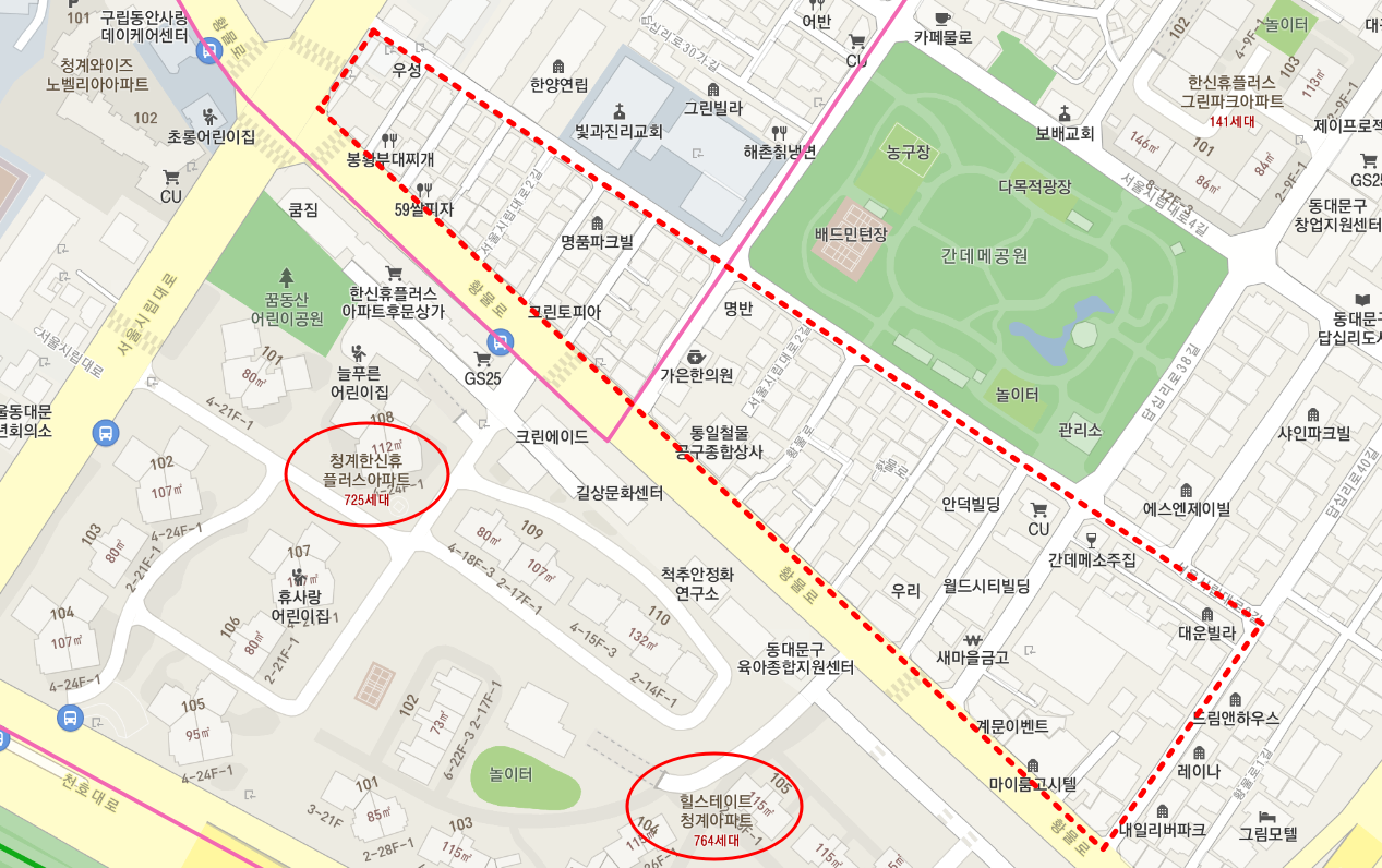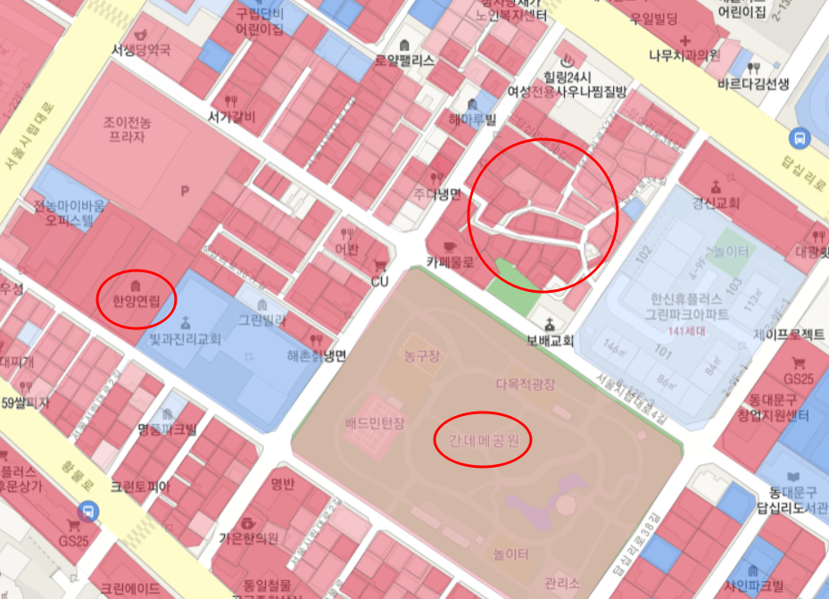 다음으로 간 곳도 대부분 노후된 건물들이 있었다. 골목도 구불 구불하고 정비가 필요해 보였다. 주로 단독주택, 다가구 주택들이 있었는데 80년대 후반에서 90년대 초중반 건물이었다. 여기도 1960년대에 지어진 건물도 있었다. 위 지도의 왼쪽에 표시한 한양연립은 전농동에 속하는데 재건축을 추진 중이다. 건데메공원은 규모가 생각보다 커서 신기했다. 그런데 공원 입구 벤치에 대낮부터 술에 취해서 자고 있는 노숙자가 있었다. 옆에는 막걸리병이 굴러다녔다.