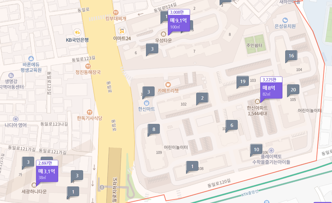 평당가는 한신아파트가 가장 높다. 우성타운 아파트는 한신아파트와 얼마 차이가 안 나는데, 세광하니타운은 평당가가 꽤 낮다. 우성타운 아파트와 세광하니타운 모두 재건축을 추진 중인데 왜 이런 차이나 나는걸까. 세광하니타운이 면적이 더 작아서 그런 것일까. 우성타운아파트는 100평방미터, 세광하니타운은 38평방미터로 나온다.