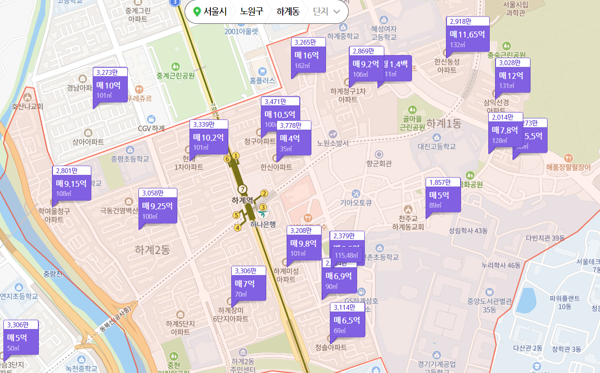 네이버부동산에서 하계역 주변 아파트들을 살펴봤다. 대략적으로 봤을 때 평당 3천만원 정도로 보였다. 역시 하계역 주변으로 역세권 아파트들이 높은 가격을 보였다. 자세히 보니 한신아파트가 평당 3,778만으로 가장 높았는데, 매매가는 4억으로 작은 평수였다. 다음으로 청구아파트가 평당 3,471만원, 현대1차아파트가 평당 3,339만원, 하계장미6단지아파트가 평당 3,306만원이었다. 이 하계장미6단지아파트 바로 왼쪽에 하계5단지 아파트가 있다.