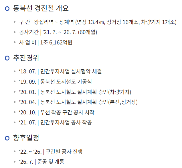 위 내용은 동북선 경전철 신설에 관한 내용으로 노원구청 홈페이지에서 가져온 것이다. 2026년 7월 준공 및 개통으로 나오는데 개통까지 아직 꽤 많은 시간이 남아있다. 그래도 동북선이 개통되면 서울 도심 접근성이 훨씬 나아질 것이다.