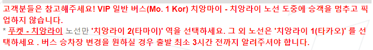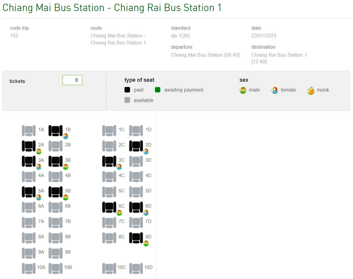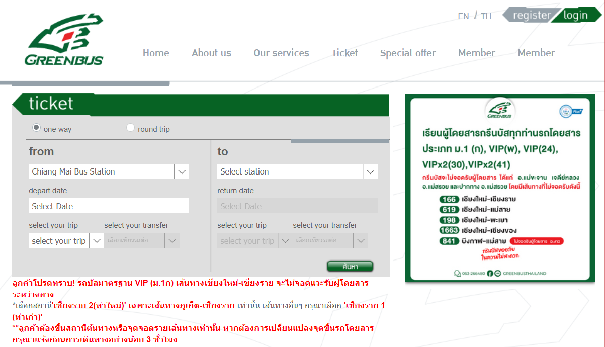 홈페이지에서 영어(EN)를 선택해도 일부 태국말이 나온다. 요즘은 구글 번역 등으로 쉽게 알 수 있다. 별로 중요한 말은 아니었다. 치앙마이 - 치앙라이 노선은 치앙마이 터미널(3)을 출발해서 치앙라이 터미널(2)를 거쳐서 치앙라이 터미널(1)에 도착한다. 중간에 기사한테 말하고 내리는 태국 사람도 있었다. 일부 여행자들도 중간에 백색사원에서 내린다고 봤다. 백색사원은 치앙마이에서 치앙라이로 가는 길에 있어서 최대한 시간을 절약하기 위해서는 중간에 내리는 것도 좋다.