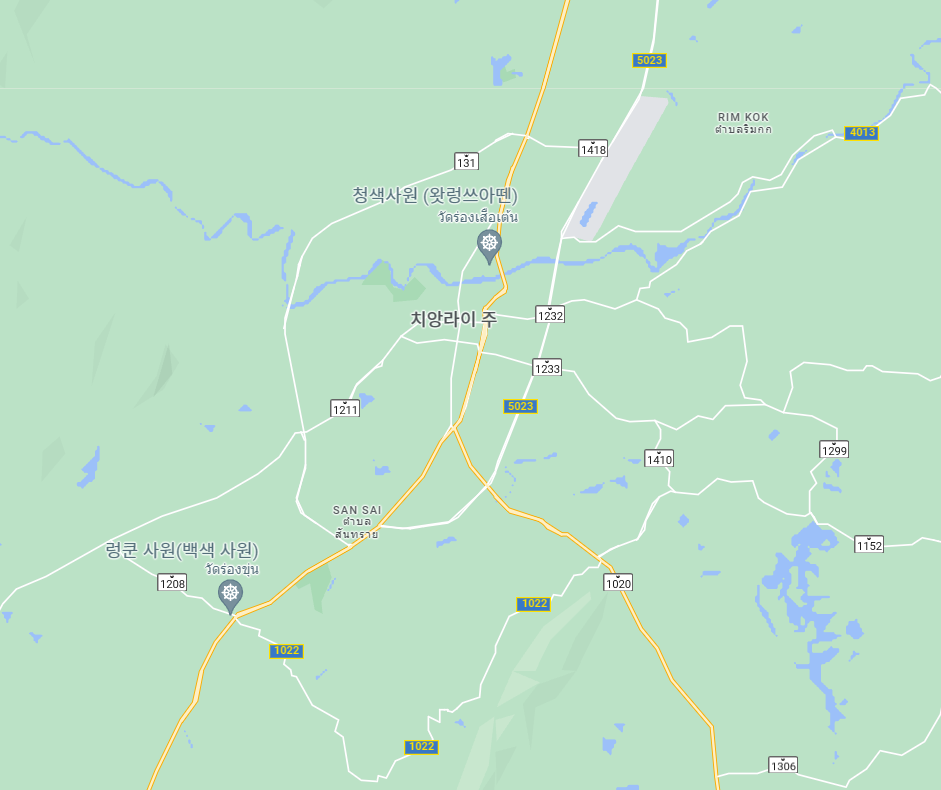 위 지도에서 '치앙라이 주'라고 표시된 부분이 치앙라이 시내인데, 주변으로 백색사원과 청색사원이 보인다. 사람들이 많이 찾는 백색사원도 치앙라이 시내에서 꽤 떨어져 있다. 그래서 치앙마이에서 버스를 타고 치앙라이로 가는 길에 중간에 내려서 백색사원을 보고 버스나 택시를 타고 치앙라이 시내로 가는게 효율적이다. 치앙라이 터미널(1)에서 백색사원까지 편도 20분이다.