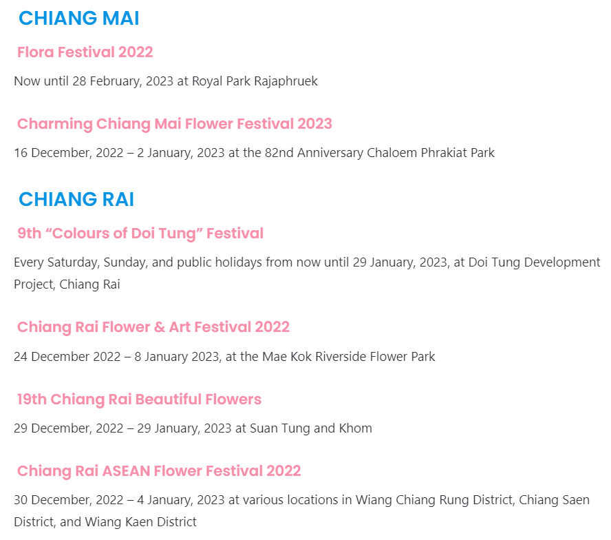 위 내용은 치앙라이 플라워 페스티벌 일정을 검색하다가 본 것이다. 축제 기간이 조금 지나서 방문해도 꽃들이 남아있을 것 같다. 치앙마이 로열 파크 랏차프룩도 다녀왔는데 다른 글에 올리겠다.