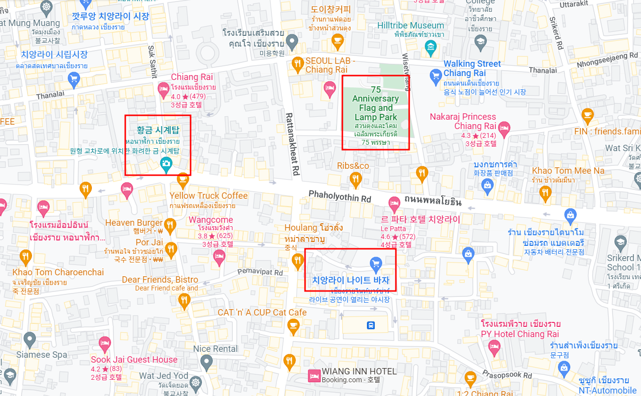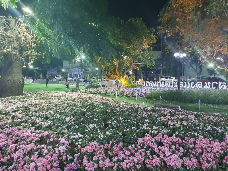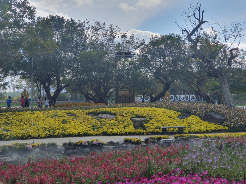 꽃축제가 열리는 곳은 75 Anniversary Flag and Lamp Park였다. 치앙라이 나이트 바자에서 완전 가까운 것은 아니고 몇 분 정도 걸어 가야한다. 또 몇 분 거리에 황금 시계탑도 있으니 같이 보면 좋다. 치앙라이 시내에서도 버스터미널에서 가까운 곳으로 호텔을 잡으면 편하다.