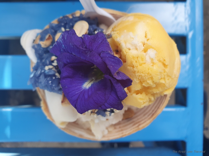 바로 이것이 청색사원까지 온 이유이다. 플라워 페스티벌에서도 많이 돌아다녔기 때문에 사원을 구경하기 전에 아이스크림부터 먹었다. 입구에서 청색사원을 바라봤을 때 오른쪽 뒤쪽으로 가게들이 줄지어 있는데 그중 두 군데에서 이런 아이스크림을 팔았다. 가격은 40바트였던가.