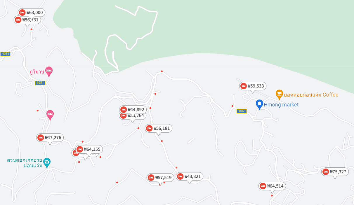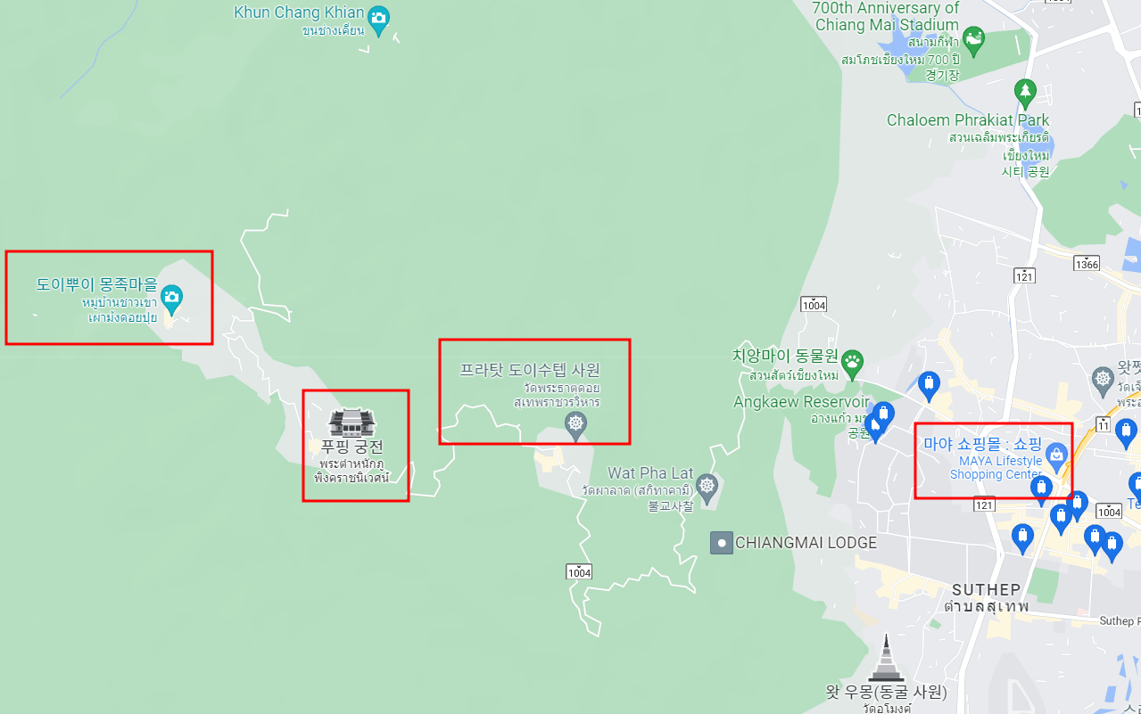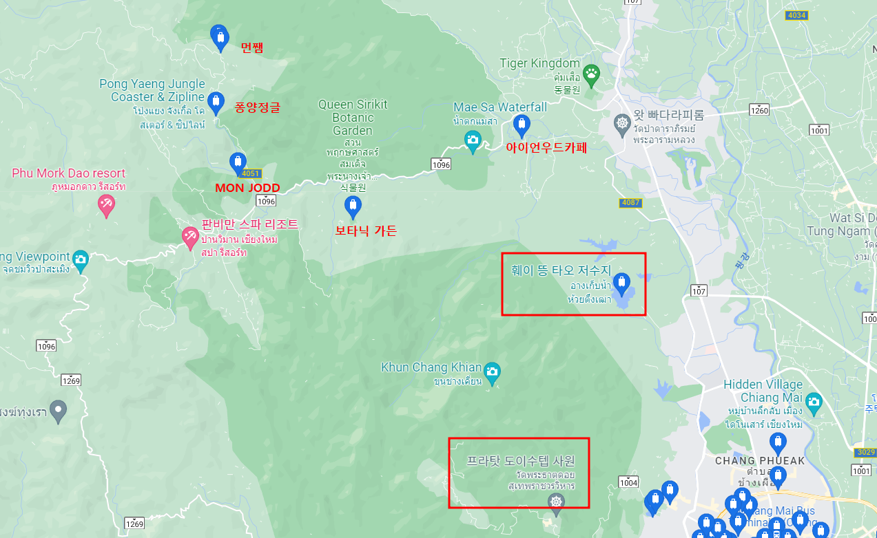 몬쨈 투어에서 사람들이 많이 가는 곳을 표시해봤다. 보통 몬쨈이라고 하는데 구글 지도에는 먼쨈으로 나온다. 영어로는 MON CHAM이다. 치앙마이 여행에서 몬쨈은 원래 계획에 없었는데 시간이 남아서 가게 됐다. 도이인타논에 갈때 동행했던 분들이랑 마음이 잘 맞아서 몬쨈도 같이 가기로 했다.