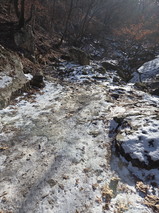 이런 얼음도 몇 번 지나갔다. 최대한 얼음을 피해서 가야하는데, 어디가 등산로인지 알 수 없었다.