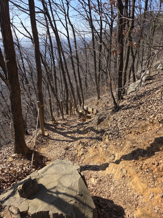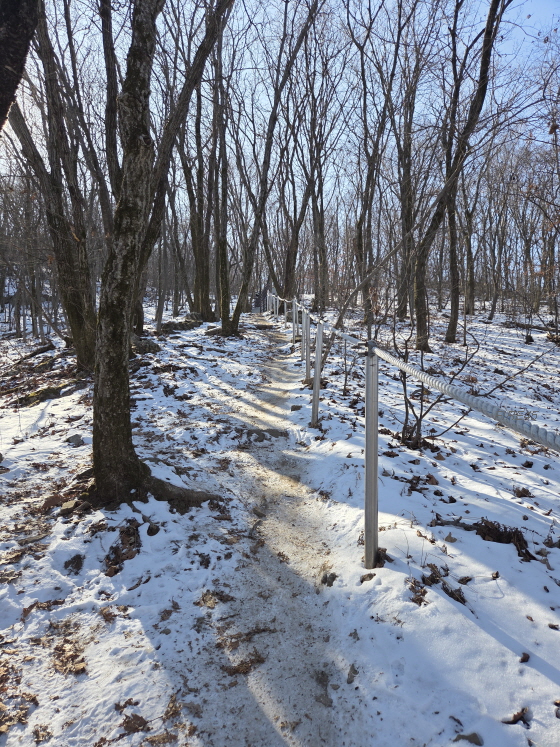 이런 구간도 있다. 여기도 밧줄도 있고 흙도 뿌려놔서 아이젠이 없어도 지나갈 수는 있는데... 안전을 위해 아이젠을 착용하는 것이 좋을 것이다.