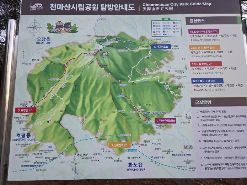 천마산 관리소 코스를 선택한 이유는 주차가 무료였기 때문이다. 주차공간은 평일 오전 7시쯤 도착해서 여유 있었고 10시쯤 내려왔을 때도 아래쪽에만 빈자리가 4~5곳 있었다. 호평동 코스에 있는 주차장은 유료 공영 주차장이라고 봤다. 오전 8시 이후부터 유료이고 요금도 그렇게 비싸지 않았다. 대중교통을 이용하거나 차량 회수가 가능하면 호평동 코스로 하산하는 것이 나을 것 같다.
