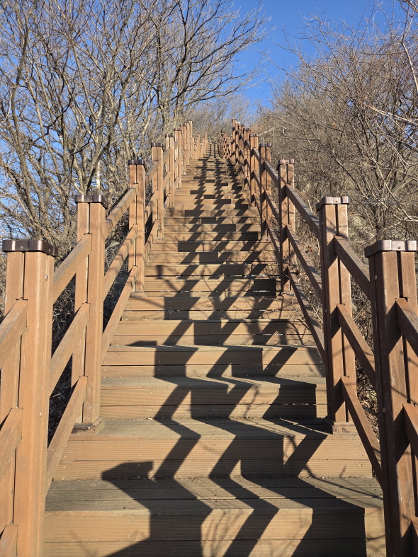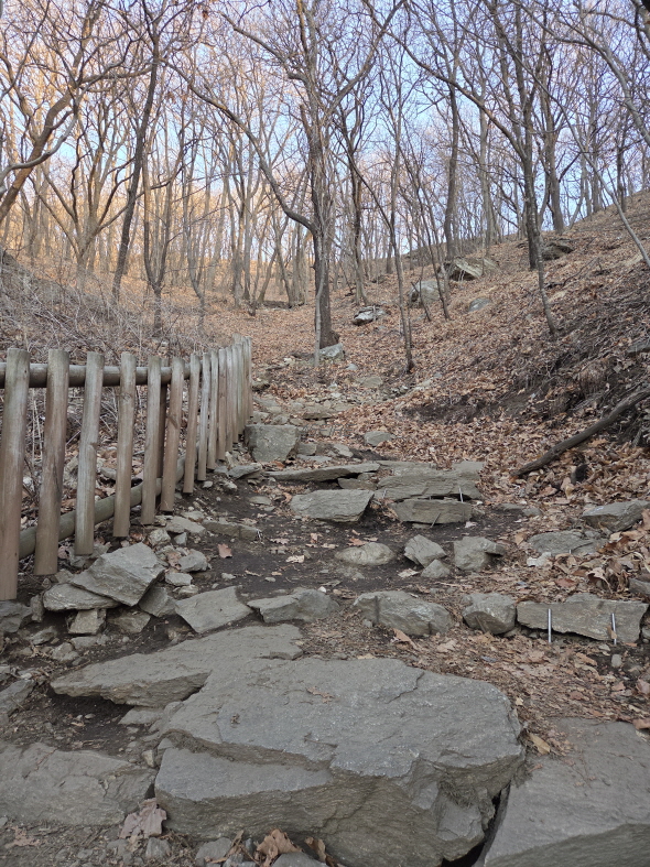 시작부터 이런 계단이 나왔다. 초반부는 슬슬 가도 괜찮을 줄 알았는데 처음부터 끝까지 힘들었다. 얼마 올라가지 않았는데 벌써부터 종아리가 털리는 느낌이 들었다. 겨울이 끝나가고 있어서 미드레이어만 입고 올라갈 생각이었는데 생각보다 추웠다.