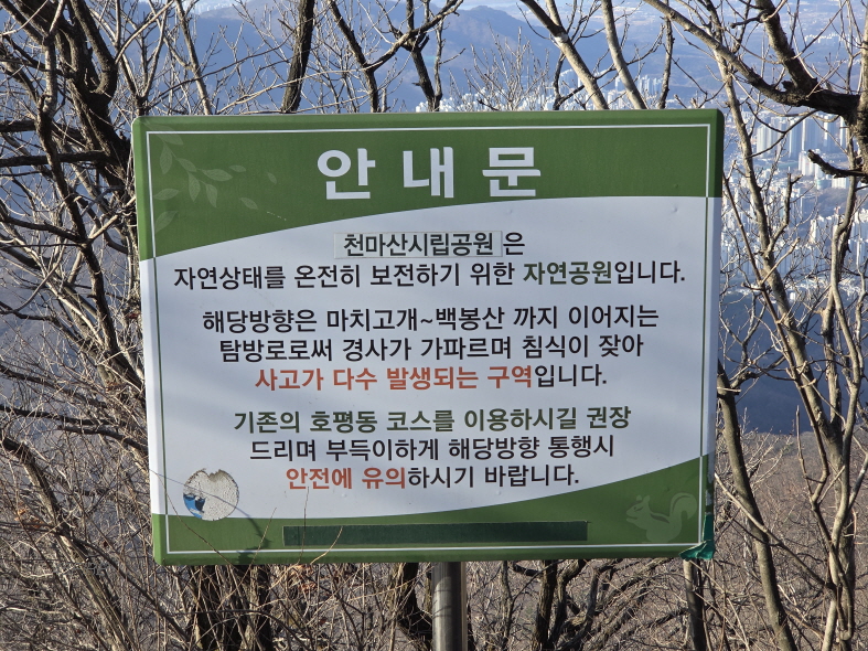 아까 말한 안내문이다. 호평동 코스 이용을 권장하고 있다. 호평동 코스는 관리소 코스와 거리도 비슷한데 어떤지 모르겠다. 어쩔 수 없이 원점 회귀를 해서 아쉽다.