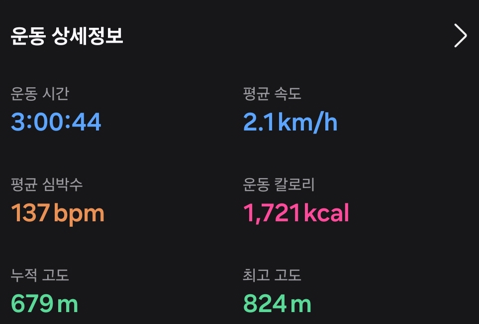 이동거리는 6.45km 였고 3시간이 걸렸다. 올라가는 데 한 시간 반, 내려오는 데 한 시간 반 걸렸다. 하산 중에는 벤치에 앉아서 잠시 쉬기도 했다. 운동을 2주 정도 쉬다가 등산을 해서 그런지 예상보다 힘들었다.