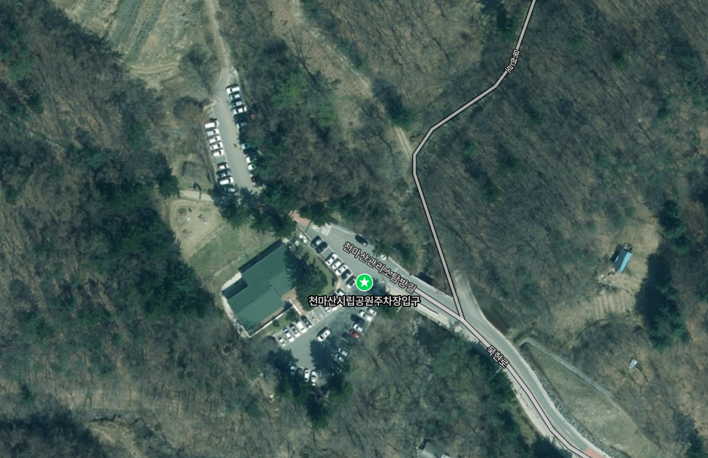 등산 시작부터 엉뚱한 길로 가서 몇 분 시간을 허비하고 다시 출발했다. 천마산 관리소 코스의 출발점은 아래쪽 주차장과 위쪽 주차장 사이에 있다. 아래쪽 주차장 구석에 주차를 했는데 그쪽에 있는 길에서 사람들이 올라오길래 거기로 갔는데 네이버지도에 나온 등산 경로가 아니었다.