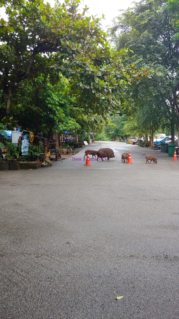 에라완 버스에서 내렸을 때 멧돼지들이 있었다. 여기 화장실이 있으니 화장실에 들리면 되고 2단계인가 3단계쯤에도 화장실이 있다. 사진 왼편으로는 쭉 가게들이 있다. 먹을 것도 팔고 기념품도 팔고 우비도 판다.
