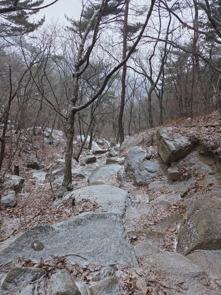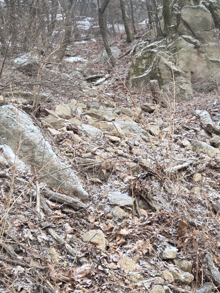 아마 위 사진과 같은 곳에서 아래쪽으로 구른 것 같다. 사진을 다시 보니까 높이가 은근히 있어 보인다. 미끄러우니까 자세를 낮춰서, 올라올 때처럼 약간 뒤돌아서 발부터 지지하면서 내려오려다 순간적으로 균형을 잃고 뒤로 굴렀던 것 같다. 순식간에 일어난 일이라서 정확히 어떻게 넘어졌는지 모르겠다.