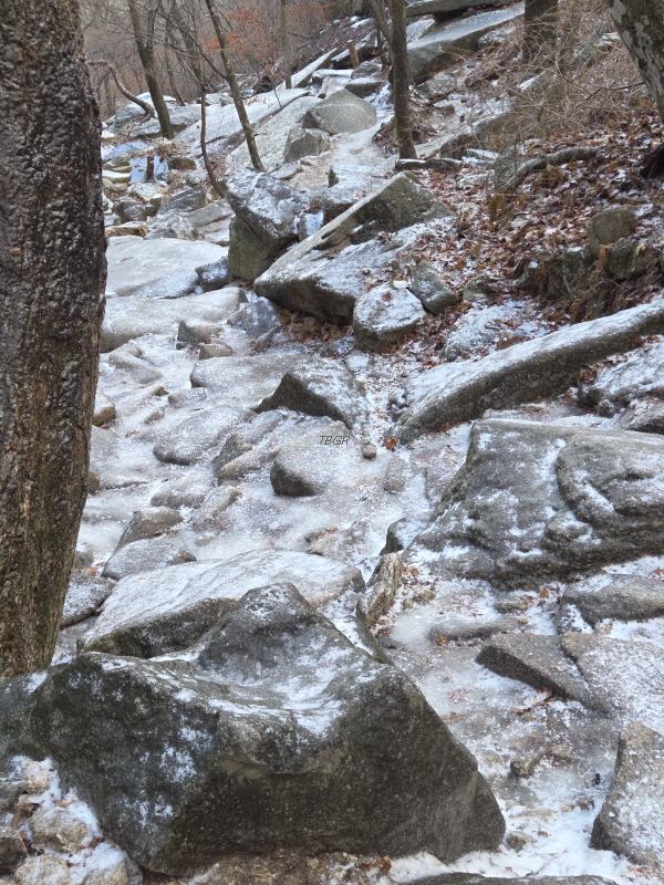 이런 길을 내려왔는데, 밧줄이나 난간이 없는 곳은 답이 없었다. 최대한 조심해서 내려왔다. 변형 불수종주 1편에 적었듯이 공릉역 출발, 장암역 도착이 아니라 반대로 갔어야 했다. 눈이 안 올 때 수락산 장암동 코스로 올라왔다면 내려갈 때는 공릉동 불암산 백세문으로 가는 완만한 길을 걷고 있었을 것이다. 아니면 날씨를 생각하고 아예 오지 않았어야 했다.