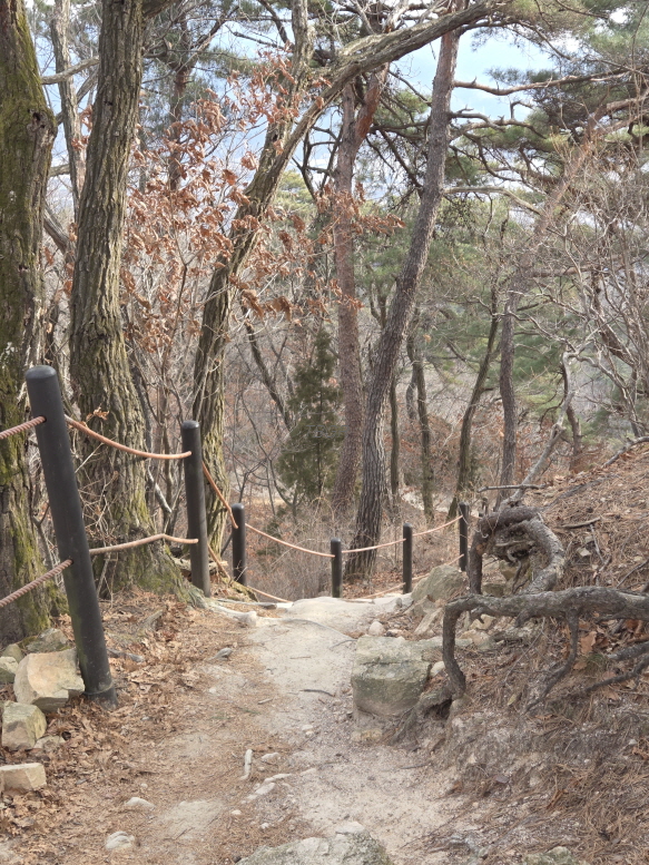 수락산 장암동 코스로 석림사를 지나 장암역으로 내려가는 길인데 눈이 쌓여서 미끄러웠다. 하지만 밧줄을 잡고 조심히 내려갔다.