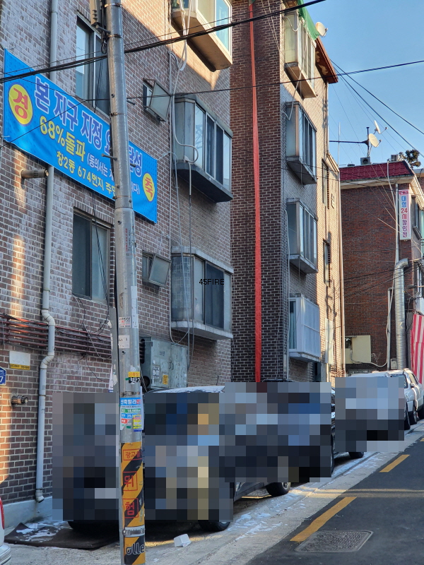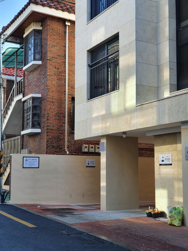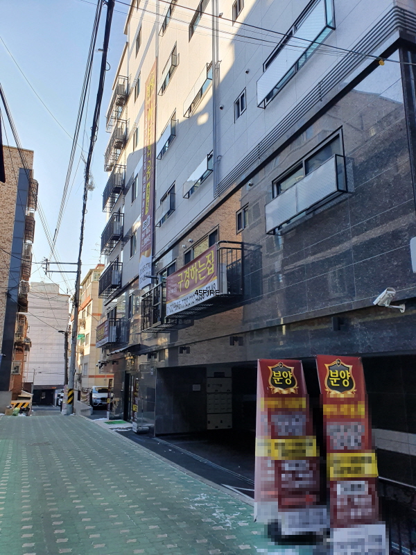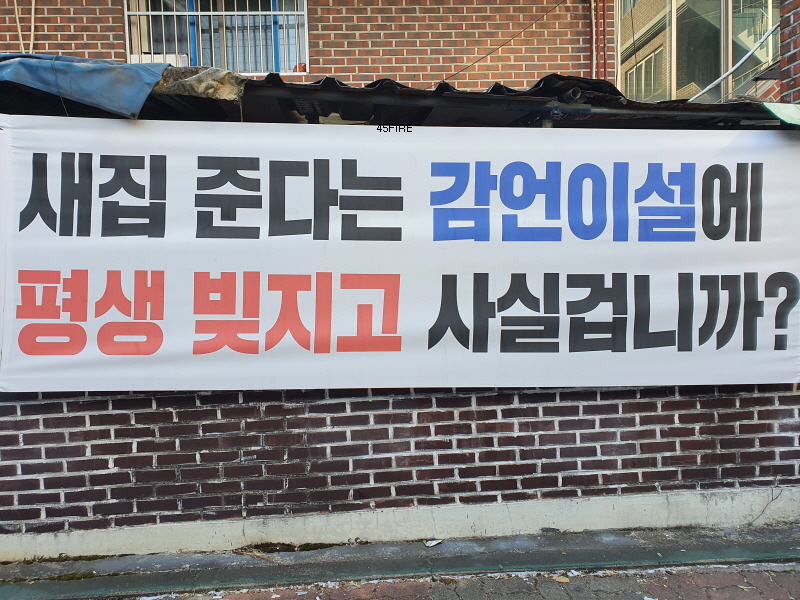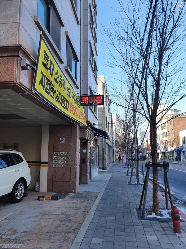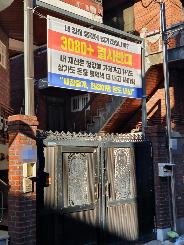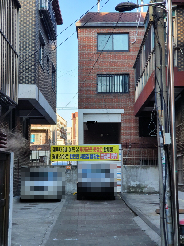 저 앞에도 현수막들이 있다. 왼쪽 건물은 분양하는 신축 빌라였다.