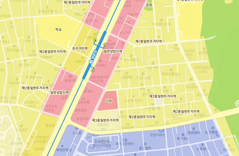 지적편집도를 보면 쌍문역 동측과 서측은 제2종일반주거지역인데, 창동 674일대는 준공업지역이다.