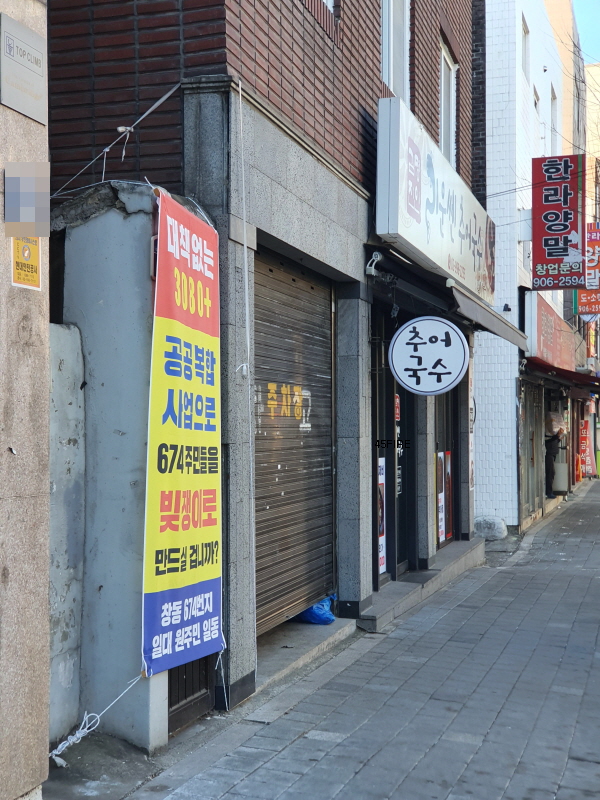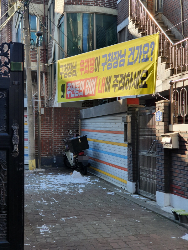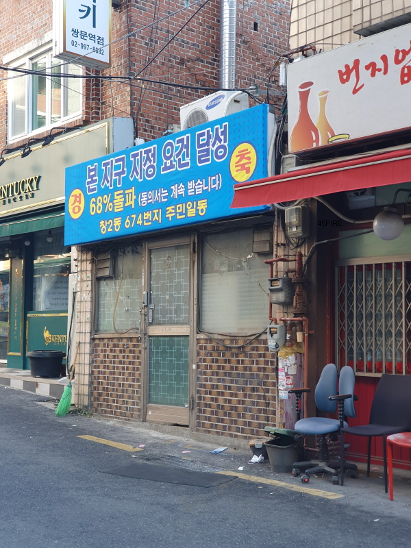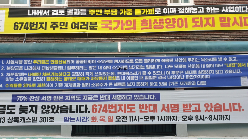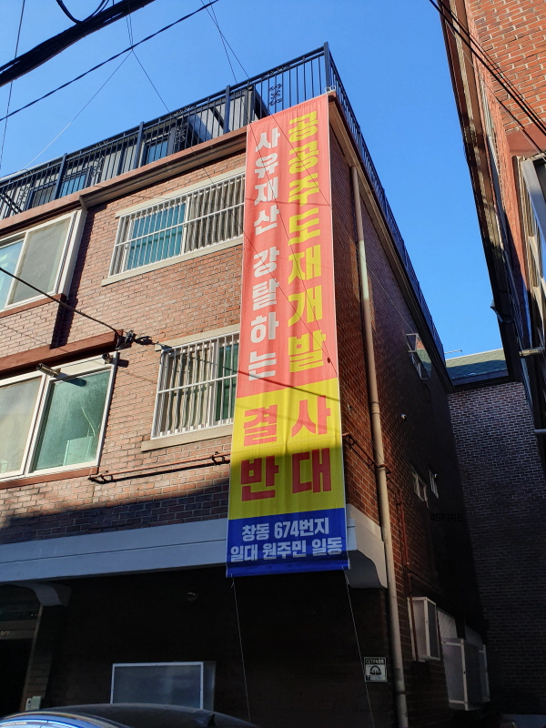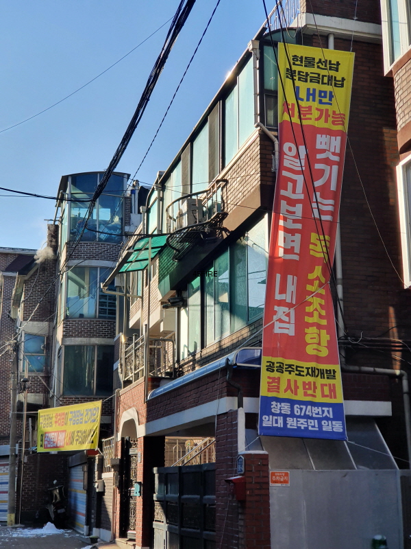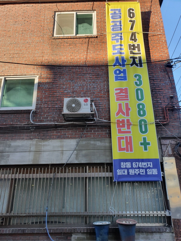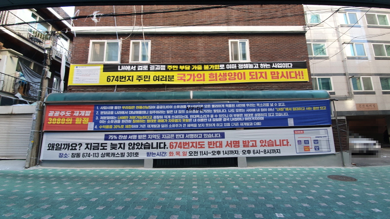 여기는 창동 674 일대 구역의 윗부분으로 2차선 도로에 접하는 곳이다. 도로변 건물에도 공공주도 재개발에 반대하는 현수막들이 걸려 있었다.
