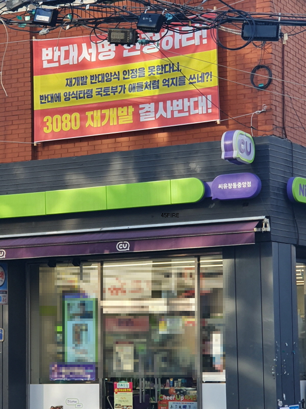 CU편의점에서 시작해서 시계 방향으로 창동 674 일대를 돌아다녔다. 시작부터 반대하는 현수막이 보였다.